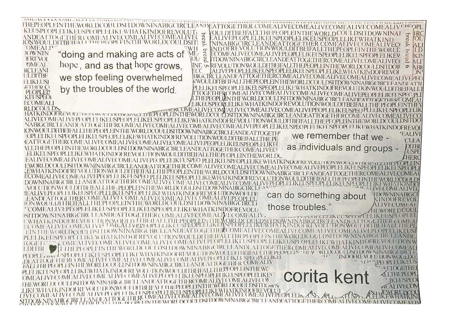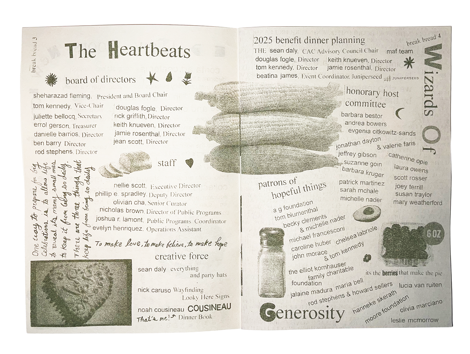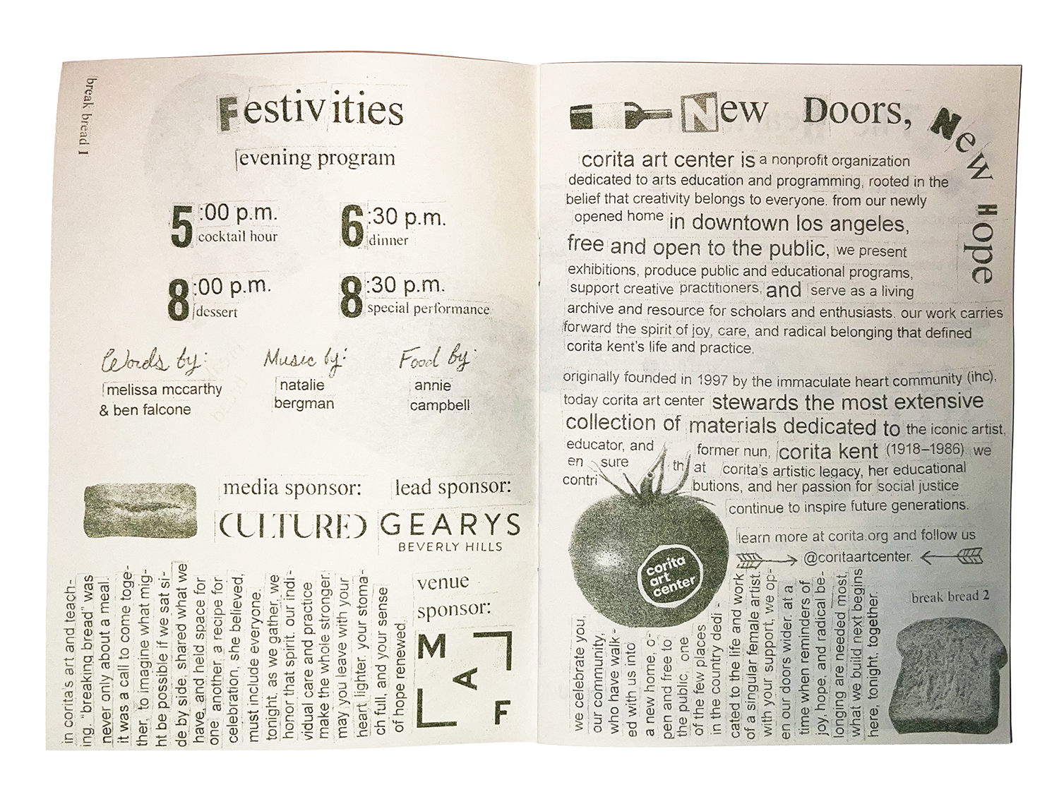 In the Fall of 2026, I was fortunate enough to be hired as a Gallery Assistant at Corita Art Center. While I originally helped with various tasks, my role evolved into creating graphic assets for the organization. This involved everything from social posts, to signage, to children's' educational worksheets. My proudest work is "break bread", a zine created for a Corita Art Center benefit dinner. The design for the zine was inspired from the "irregular bulletin", a student-made newsletter that was created during Corita Kent's tenure at Immaculate Heart College.